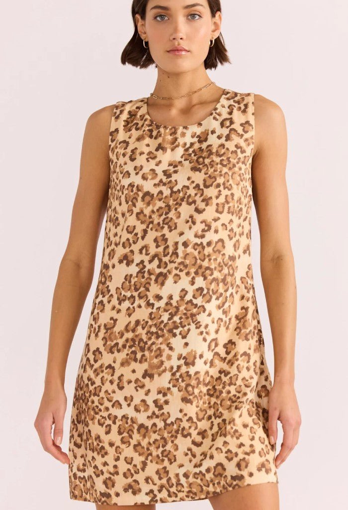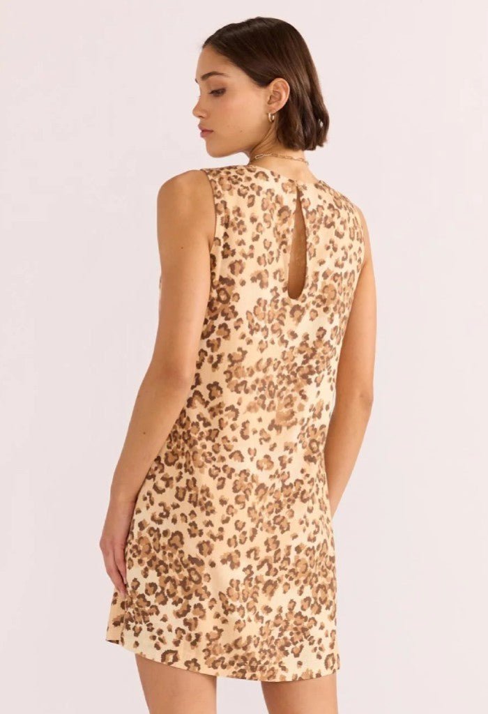 The Arden Shift Mini Dress in leopard print is the perfect statement piece. Featuring a relaxed silhouette, and a soft leopard pattern. This print is exclusive to MINKPINK. Style yours with a chunky slide, or barely there sandal to complete the look.