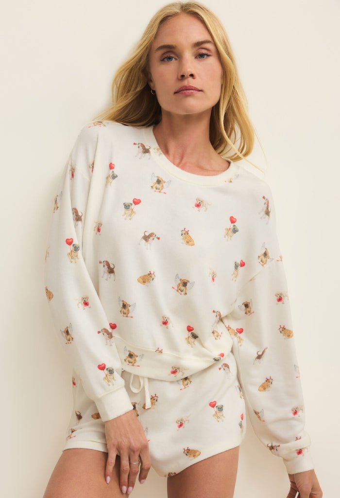 Get comfy in our Bisous Love Pup Top. A sweet puppy print and soft brushed knit makes this perfect for a chill day at home.