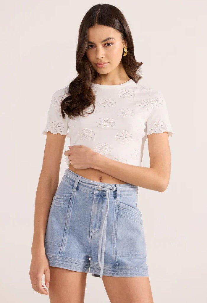Sweet and simple with a touch of charm — the Bowie Pointelle Knit Tee features delicate floral eyelet detailing, scalloped edges, and a flattering fitted silhouette. The soft, stretchy fabric makes it perfect for warm days, while the playful design adds a feminine twist to any casual look. Pair it with denim or skirts for an easy, breezy outfit.