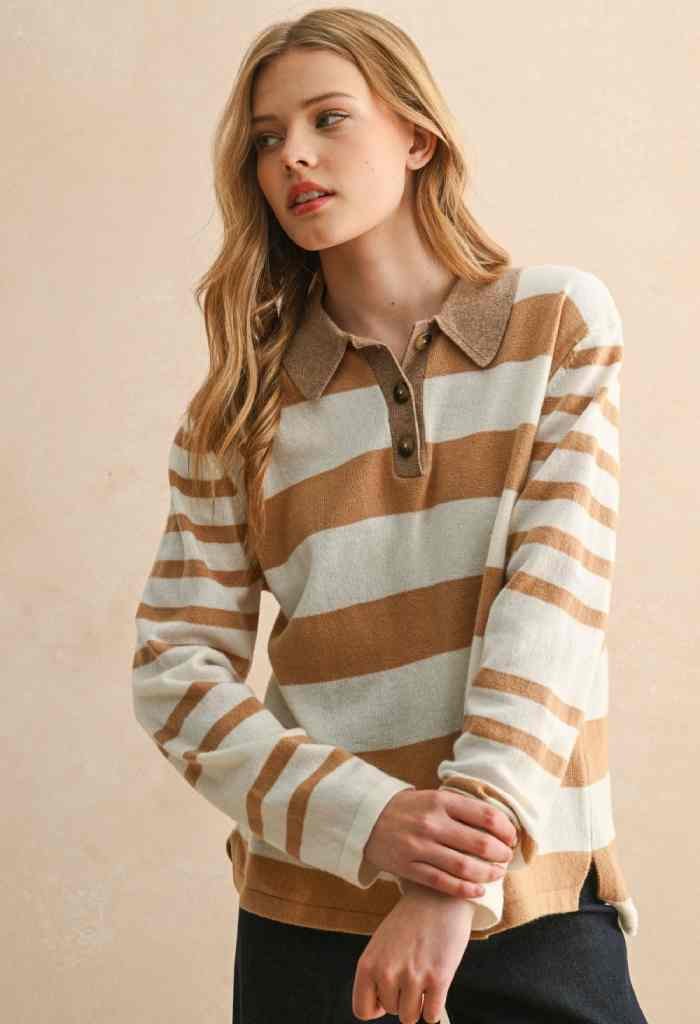 Warm up in our Caramel Macchiato Polo. This sweet top features timeless stripes and a classic collared neckline with button closure. Effortlessly stylish, it’s perfect to throw on with denim or tuck into a mini skirt with tall boots for a preppy vibe.