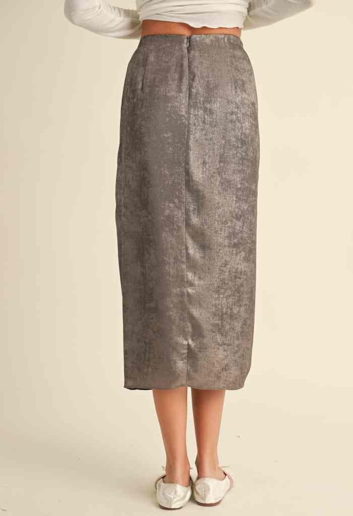 Make a statement in the Champagne Toast Midi Skirt. This stunning skirt features elegant pleats and a playful metallic bronze design. Pair it with a cute top and tennis shoes for a casual vibe or dress it up with a chic blouse and heels for a night out.