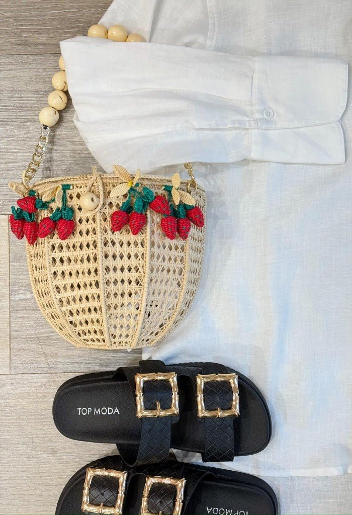 We’re sweet on the Handmade Palm Bag. This oh-so-cute bag features an adorable wicker design with a beaded handle and strawberries for a playful touch.