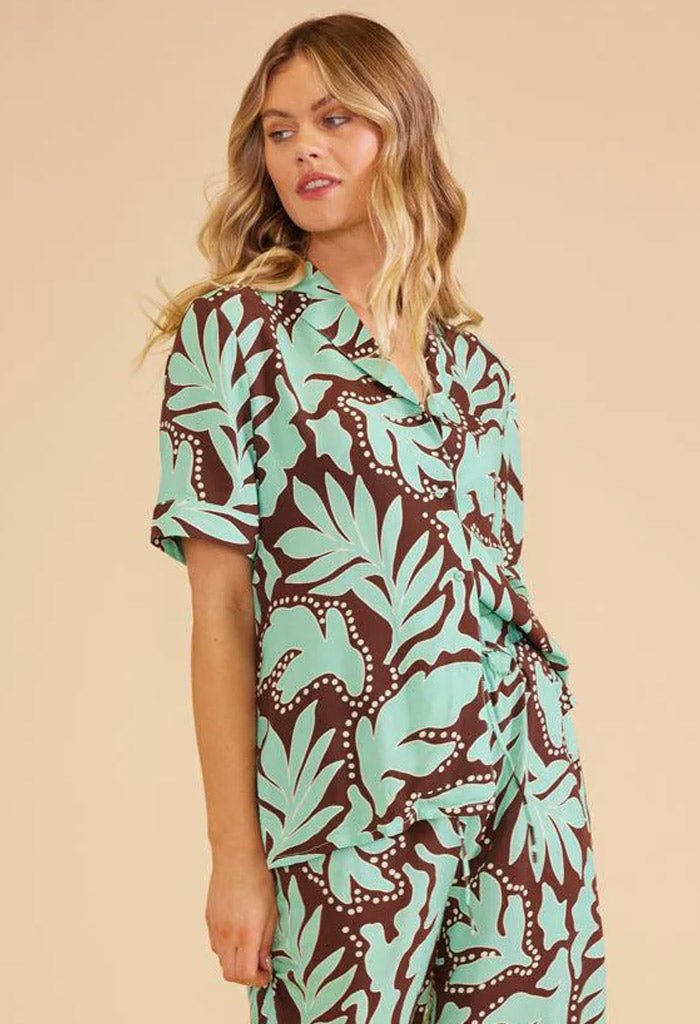 The Kelani Shirt is a relaxed resort style featuring an exclusive bold leaf silhouette print. Pair with the for a matching look while relaxing poolside or at the beach.