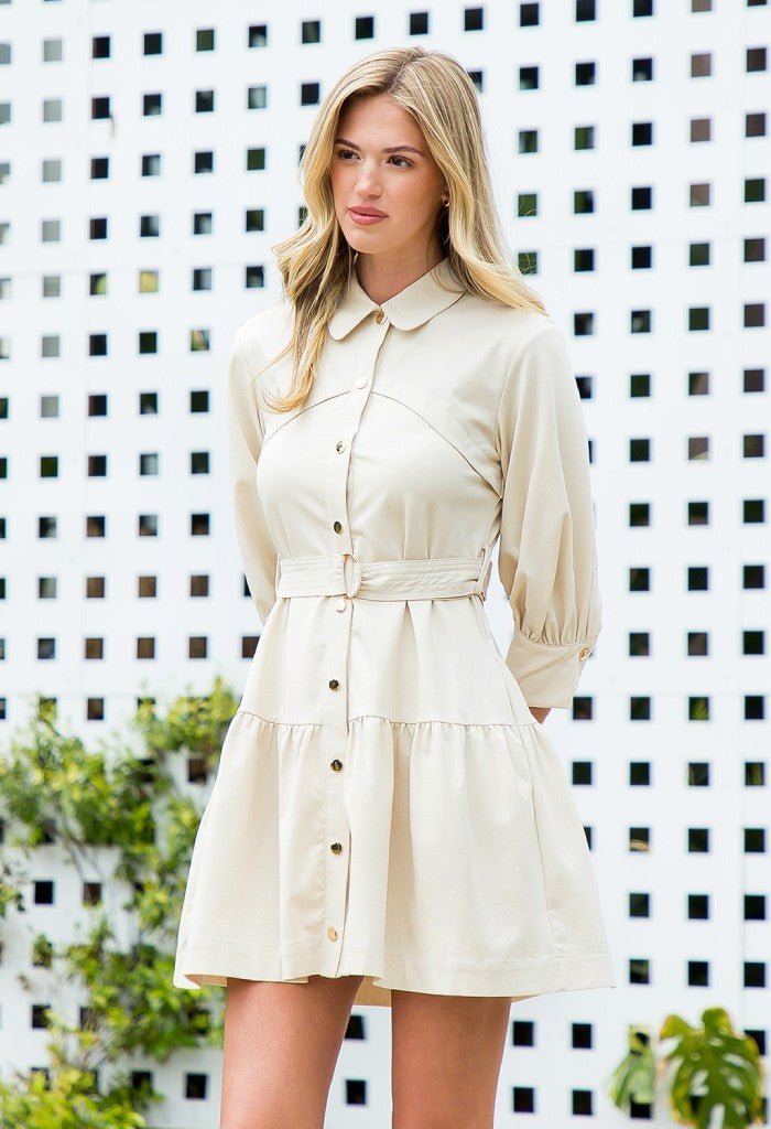 Meet the closet staple you’ll be wearing on repeat. Pretty and posh, this stylish mini features a classic collared neckline with gold buttons and a belted waist. Slip it on with a chic headband and ballet flats or rock it with strappy heels for this season’s soirées!