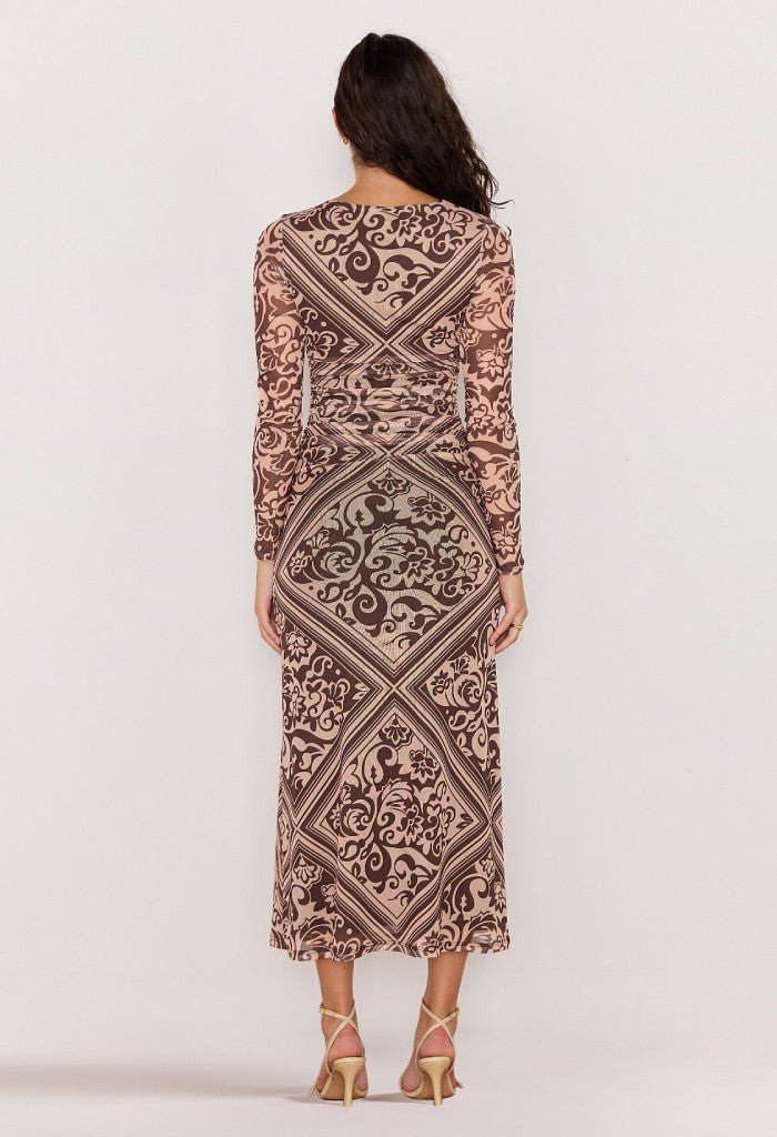 The Lumi Mesh Midi Dress makes an entrance. Designed in a statement baroque-style print, this body-hugging silhouette features full-length sleeves, side ruching and a soft mesh overlay. Fully lined for comfort, it’s the perfect mix of bold and elegant.