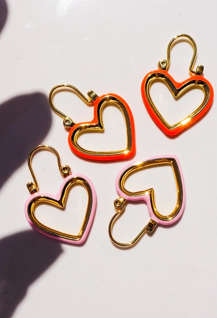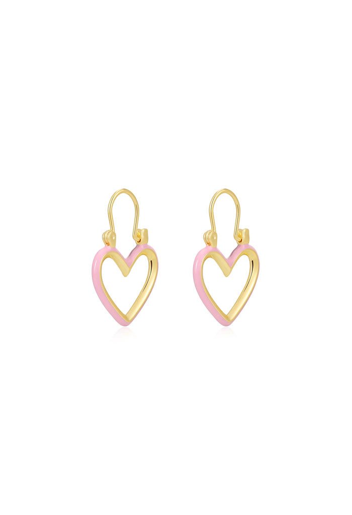 Pair of baby pink enamel heart-shaped earrings with a U-shaped earring bar.
