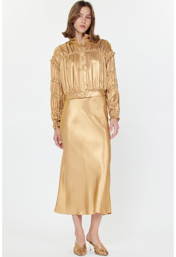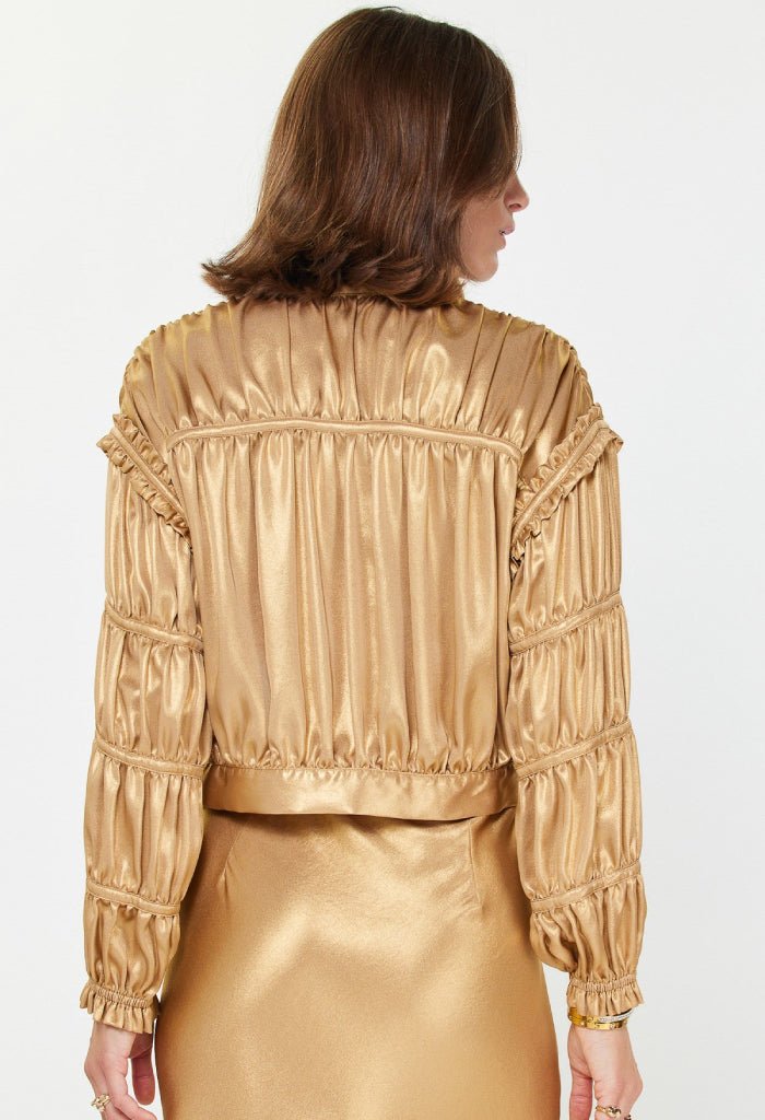 Go for the gold in our Moondust Jacket. Chic shirring with a cropped length and relaxed fit makes this the ultimate statement piece. Pair with a cute tee and jeans for a casual vibe or dress it up with a stylish cami and the Moondust Midi Skirt for a night out.