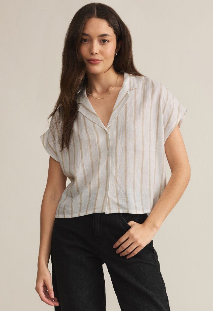 Crafted from textured linen, this striped button-up has a laid-back vibe with open sleeves for comfort and dded style. The midweight fabric makes it ideal for warm afternoons or layering under jackets on cooler days.