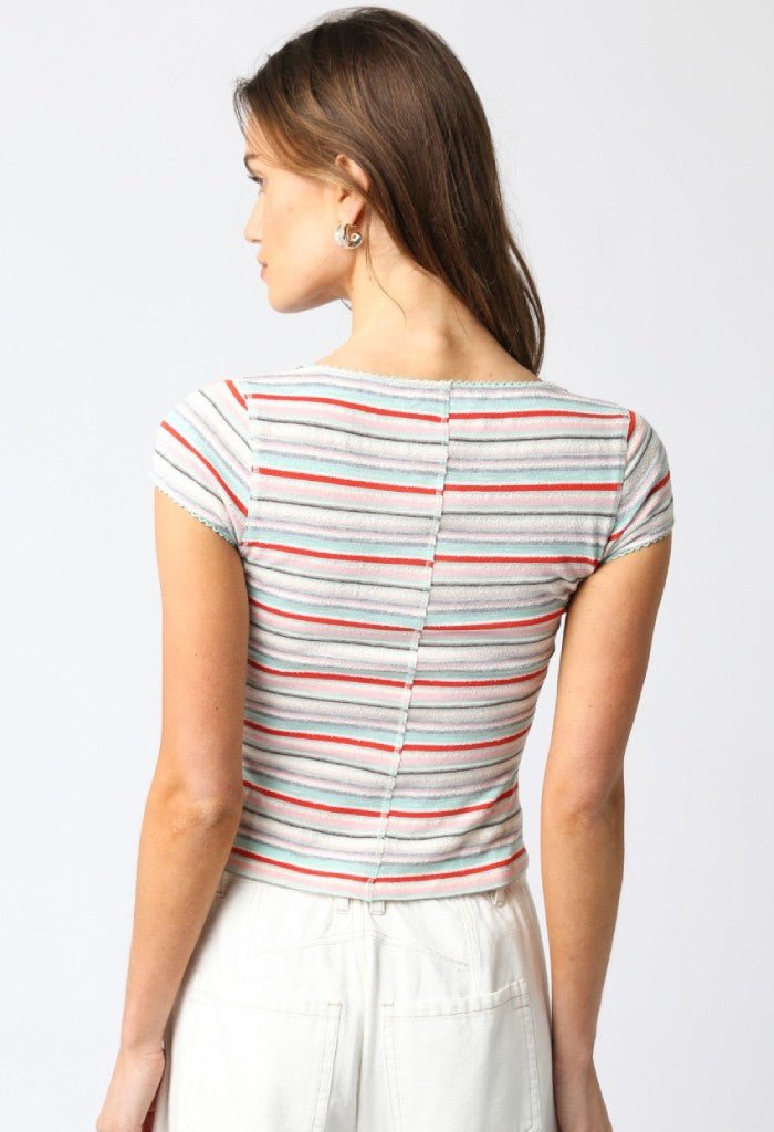 Earn your stripes in the Summer Love Tee. This sweet t-shirt features front button-closure with timeless stripes and scalloped detail. Throw it on with shorts or a cute mini skirt and tennis shoes while boppin’ around town.