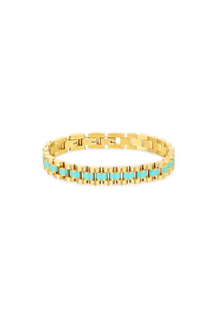 Thin, brushed metal timepiece bracelet with turquoise blue enamel.